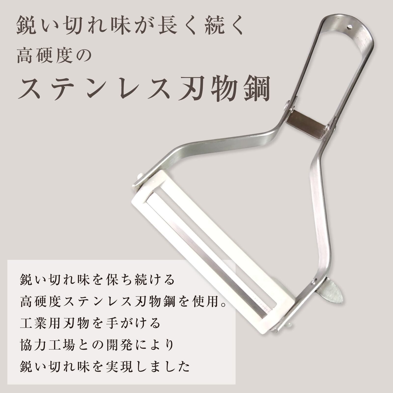 このプロピーラーAIR3は、徹底して皮むきの効率を追求した製品です。特に注目すべきは、切れ味に優れたステンレス鋼材を用いており、独自の刃の設計により、薄く皮をむくことを実現しています。最高級の420J2鋼を使用し、刃の持ちも良く、長期間にわたってその切れ味を維持します。