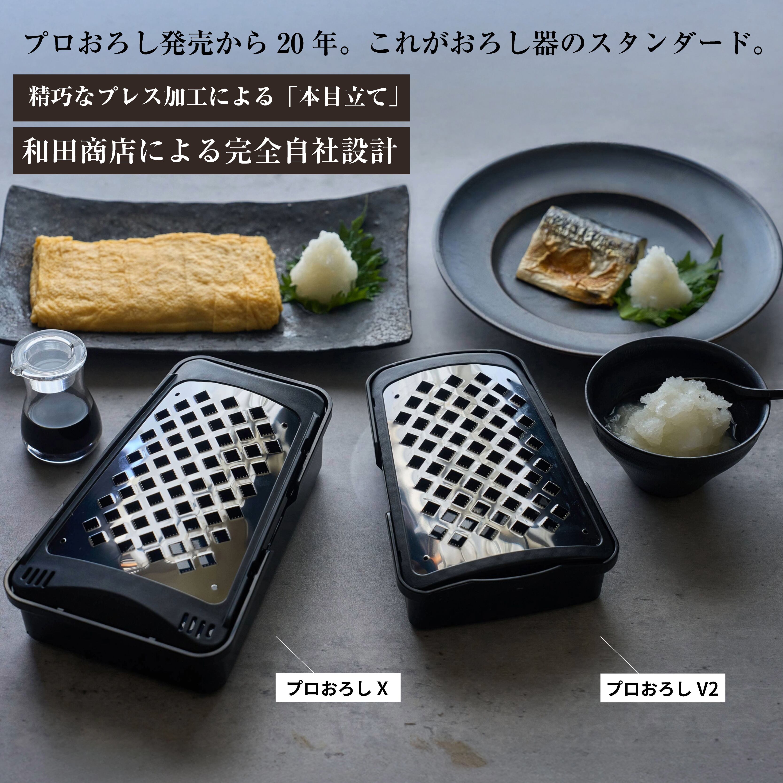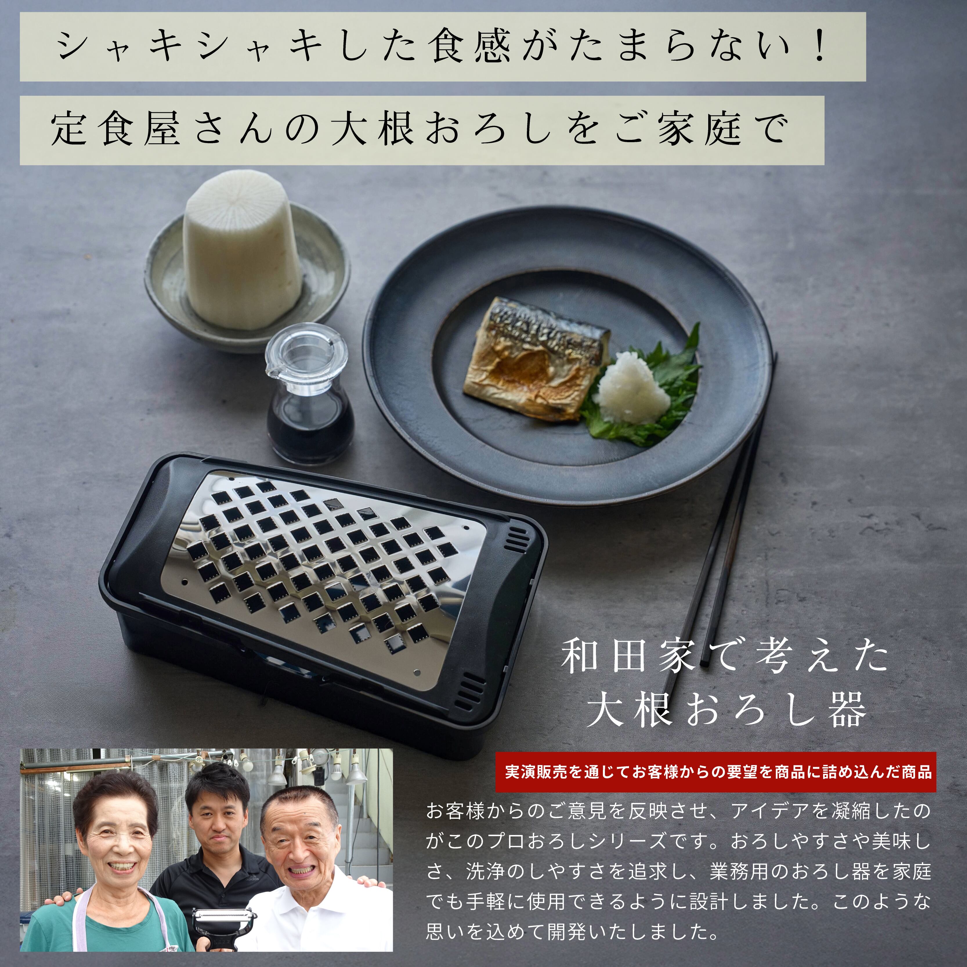 和田商店が一から設計し、新潟三条の工場で製造されたこのおろし金は、伝統的な技術と現代的な機能性を融合させた、まさにプロ仕様の逸品です。