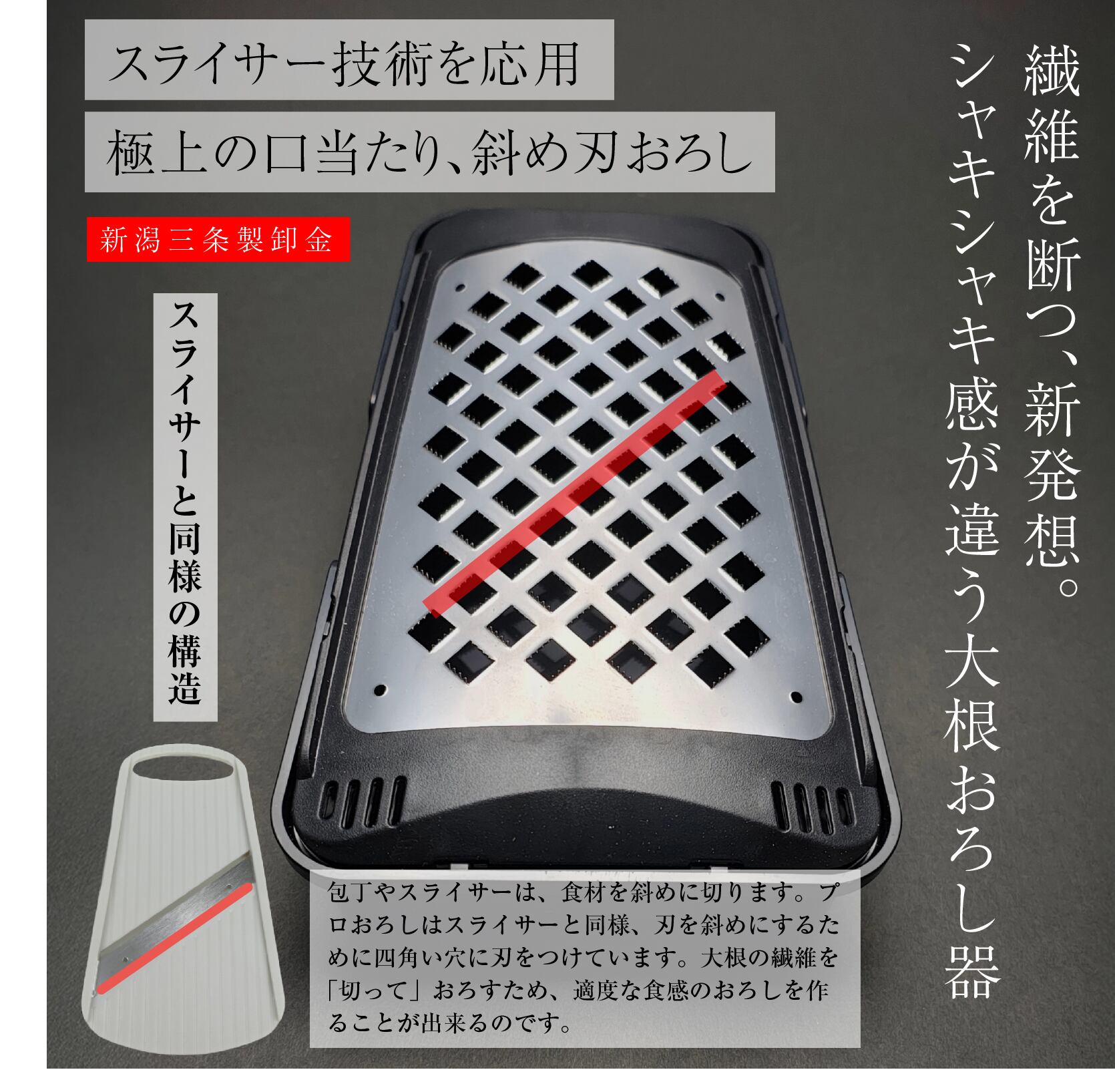 このおろし金は、大根おろしをシャキシャキとした食感に仕上げるために、非常にこだわり抜かれた製品です。特に注目すべき点は、ステンレスプレス加工であえてバリを残すことで、大根の繊維をしっかりと絡める設計がなされている点です。通常、ステンレスの加工ではバリを取り除くのが一般的ですが、この製品では敢えて残すことで、繊維をひっかき、より滑らかで舌触りの良い大根おろしを実現しています。この技術は、食材に醤油などの調味料がよく絡むようにし、味わい深い一品を提供することができます。
