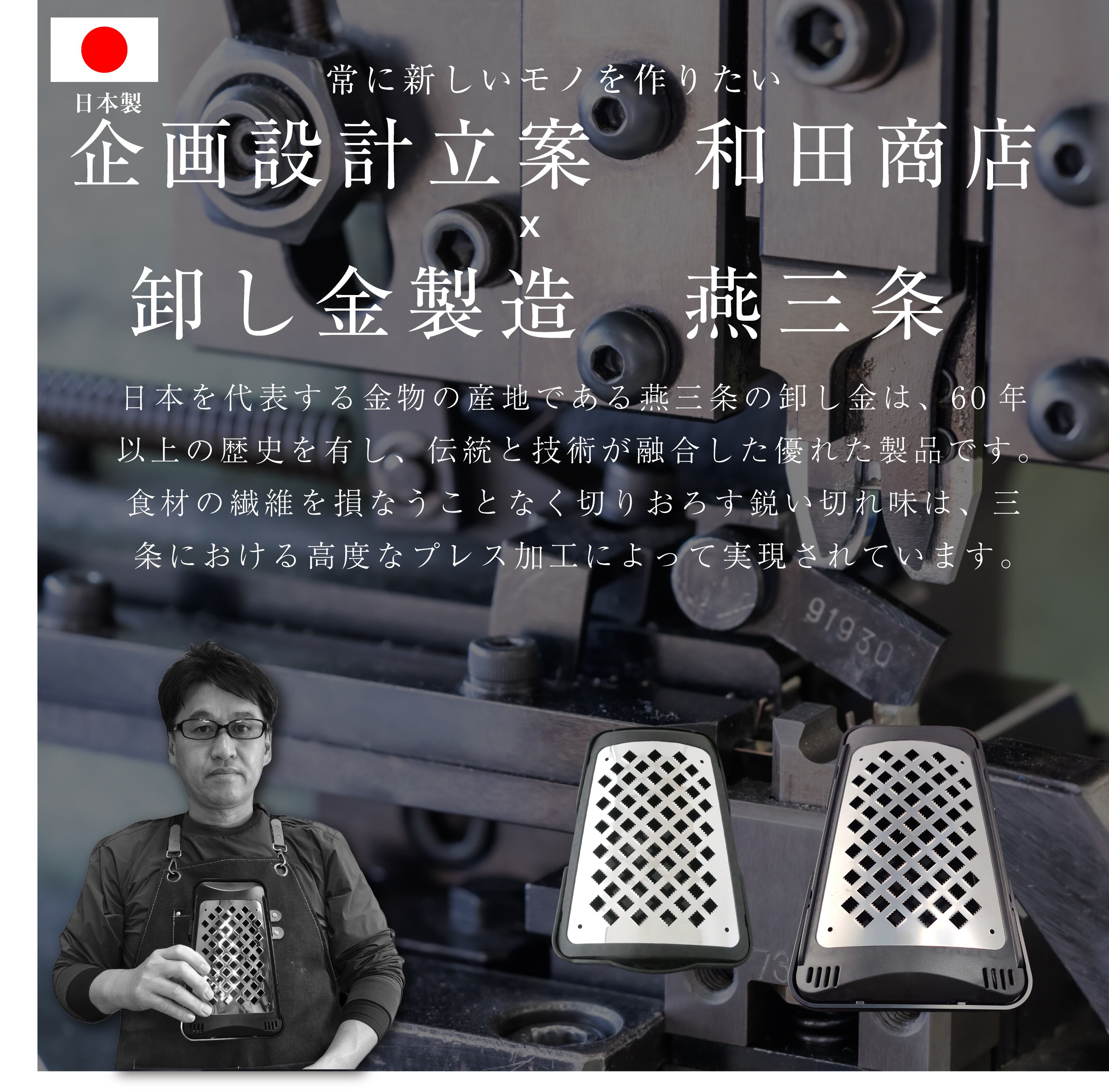 新潟三条で製造されたこのおろし金は、伝統技術をもとに、現代的なデザインが融合した逸品です。食材本来の味わいを引き立てるために、ぜひこのプロおろしV2をお試しください。